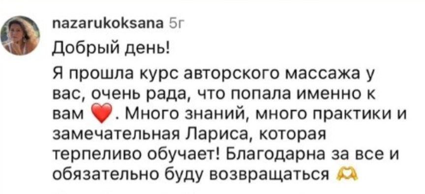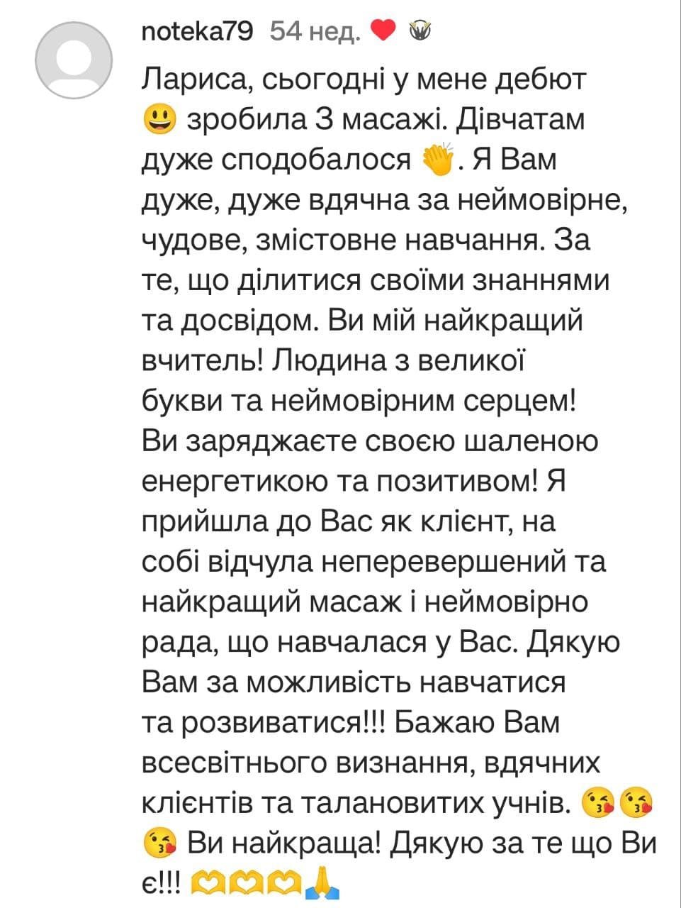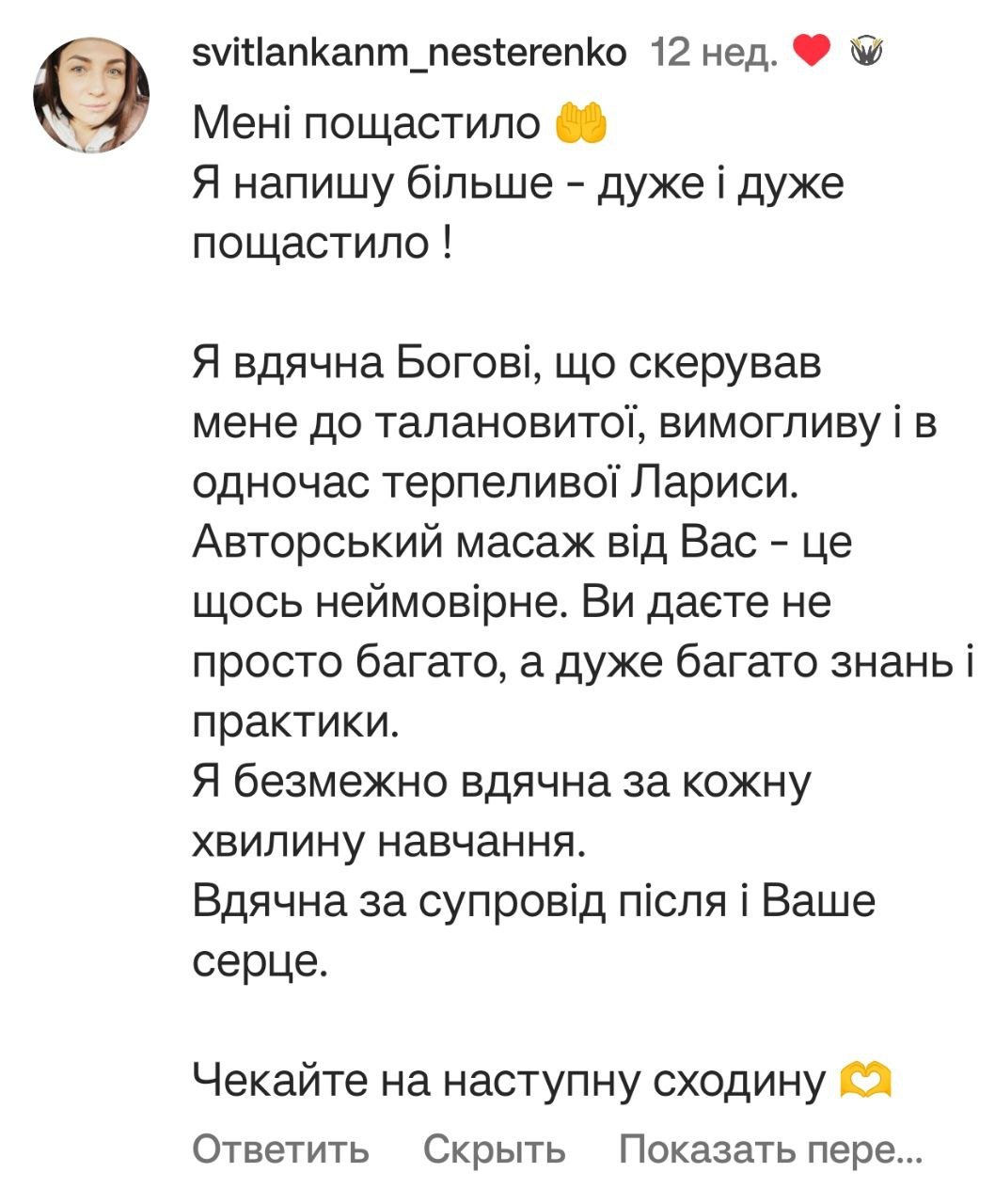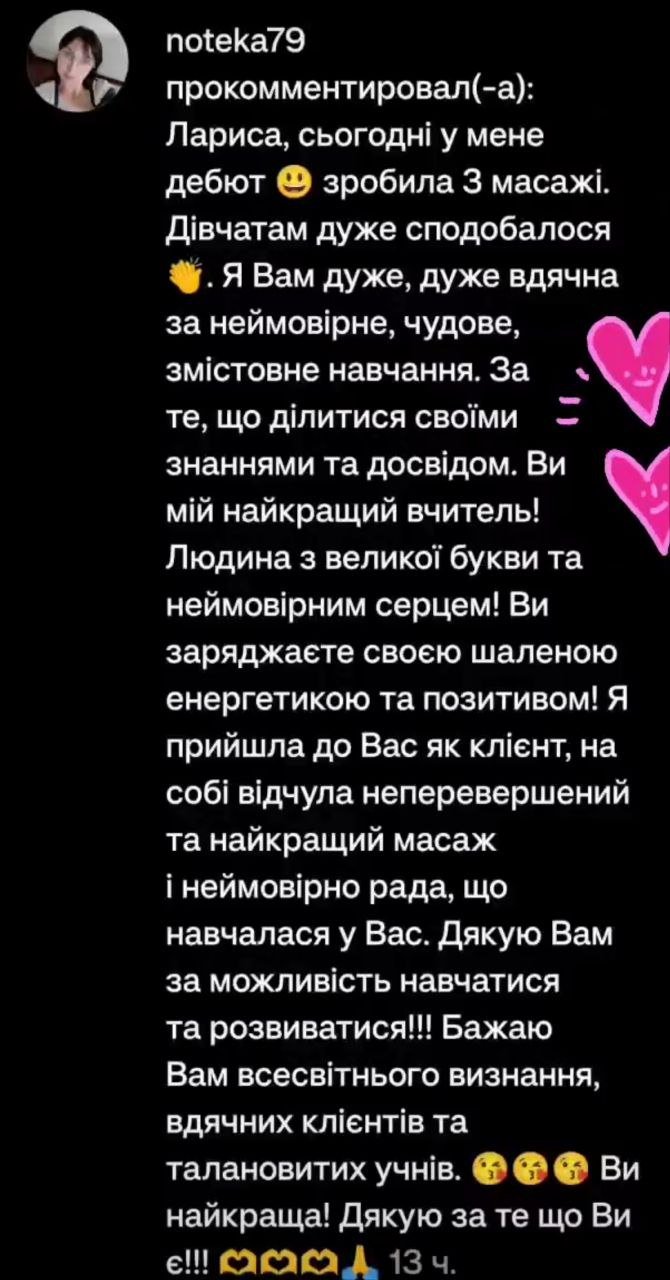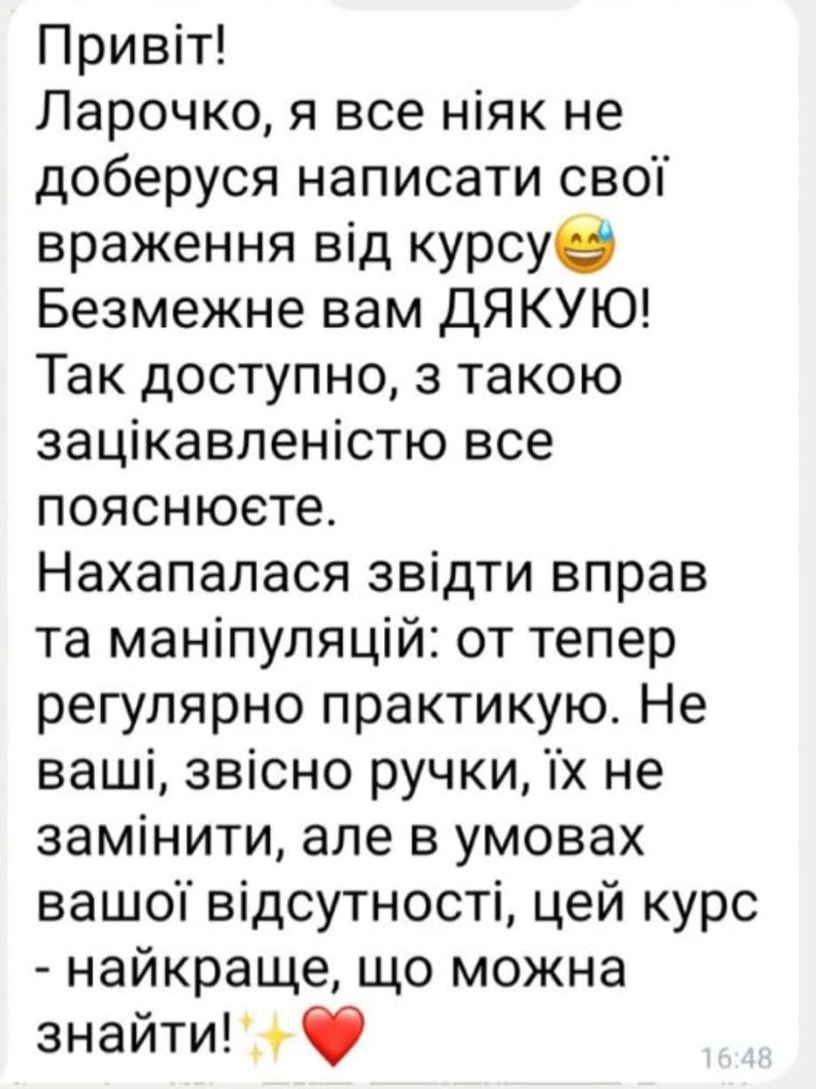 - Надаю відео слідуючого заняття і так до завершення всіх уроків масажу. Навчання походить в індивідуальному телеграм каналі.